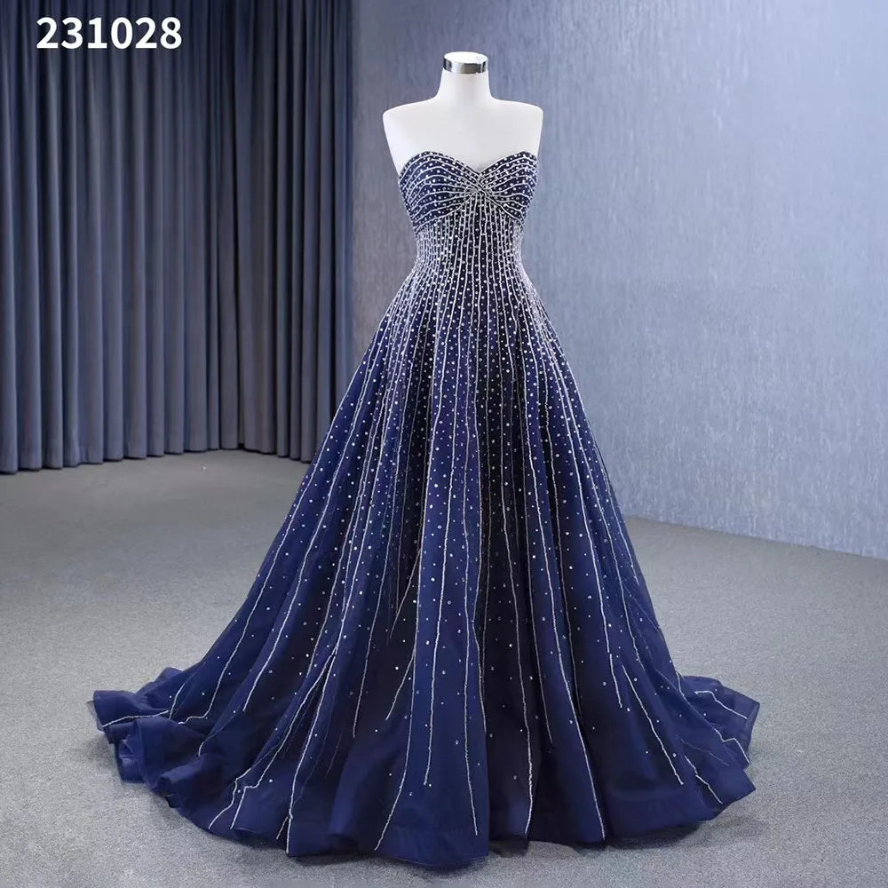 Vestido de novia azul marino de alta gama, sexy, sin tirantes, con cuentas de cristal, de lujo, con cordones y perlas, hecho a medida HM23102