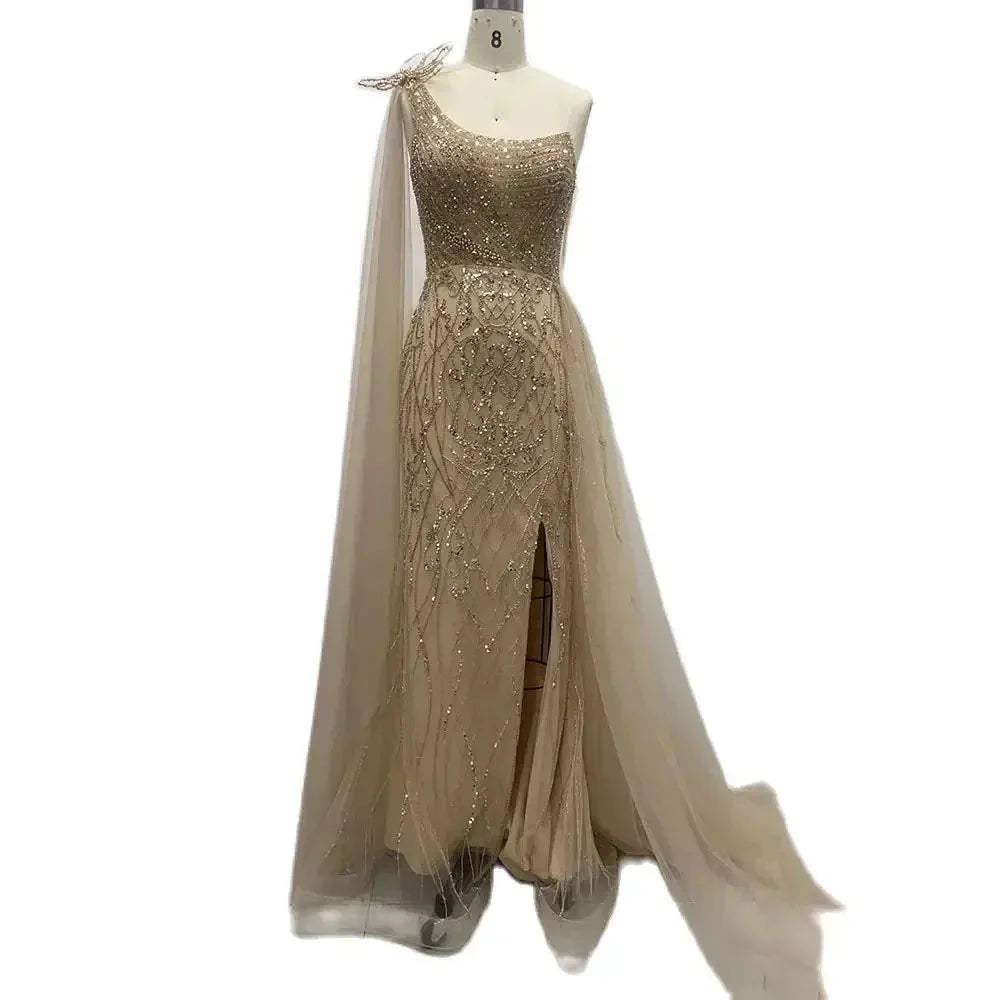 Vestido de noche árabe color piel, con cola lateral y un hombro, corte sirena, para mujer, para fiesta formal de graduación, boda, 2025 LA72442