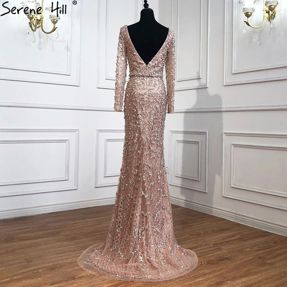Vestido de noche estilo sirena color melocotón con escote en V, estilo Dubái, mangas largas, con abalorios, diseño LA70499