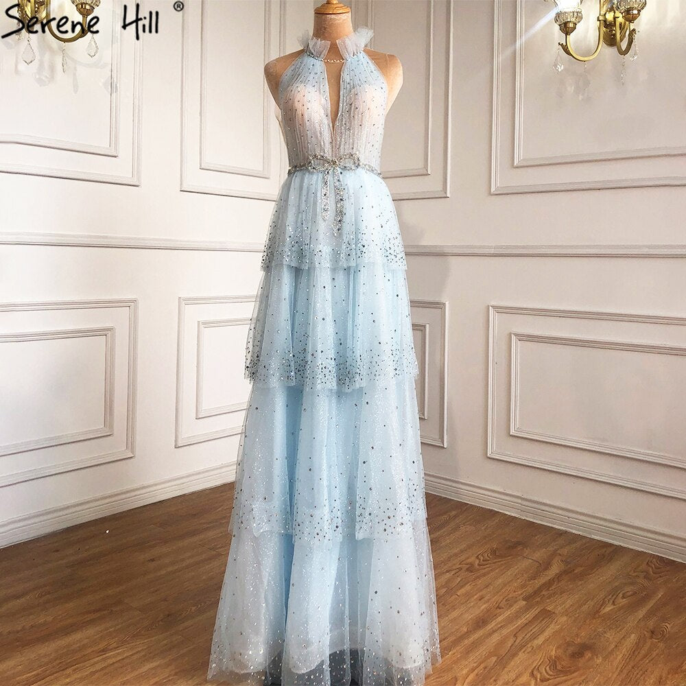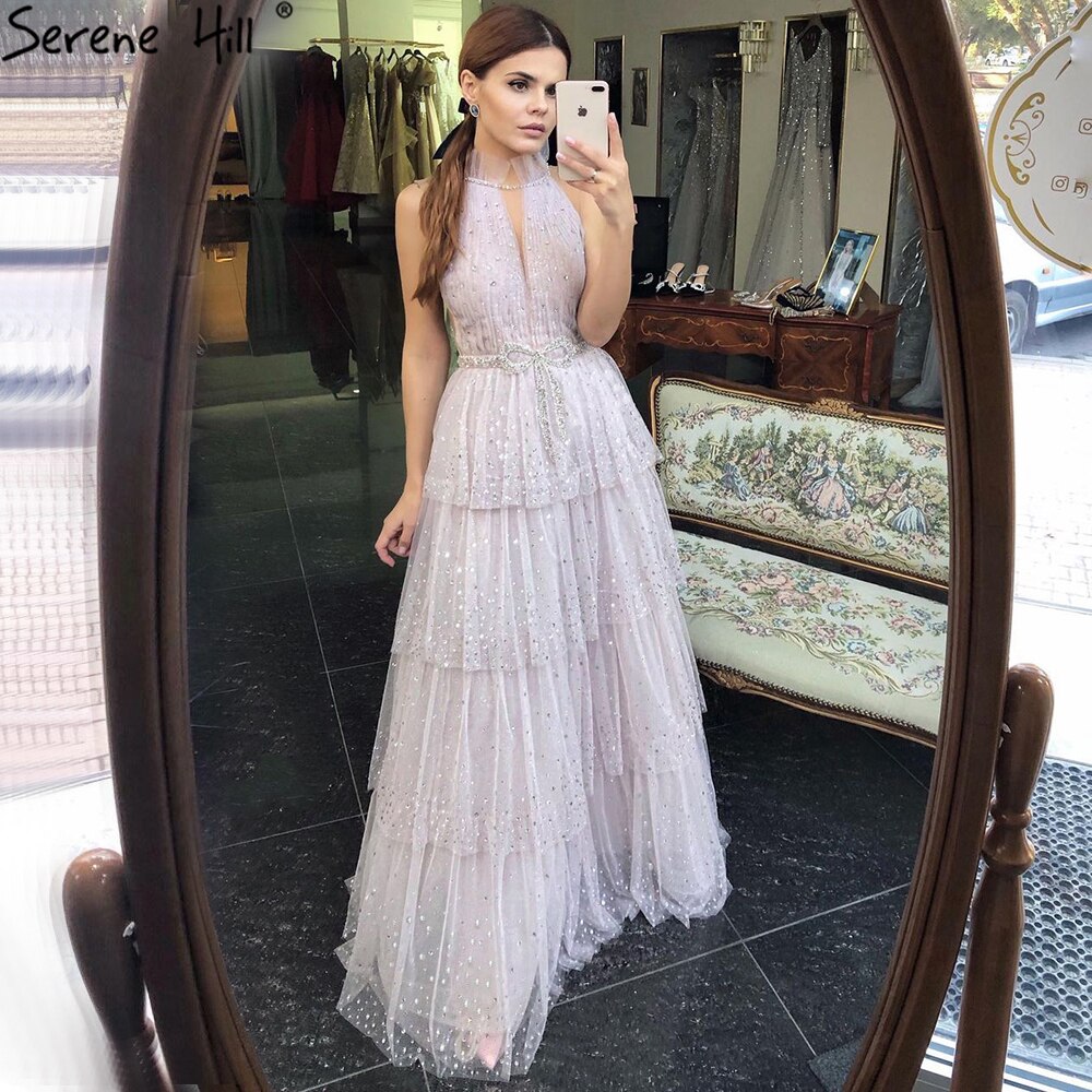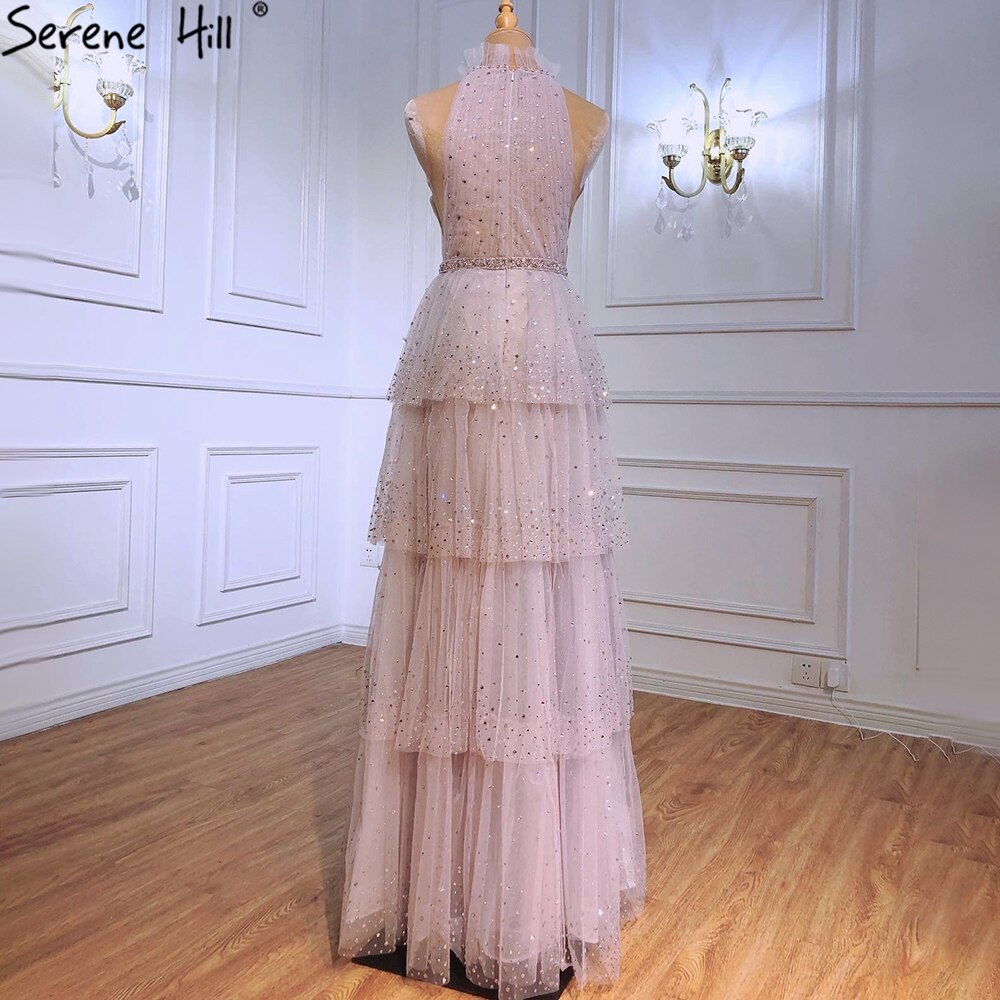 Vestidos de noche de lujo en color rosa, corte A, 2025, cuello halter, cuentas, tul escalonado para mujer, fiesta LA70806