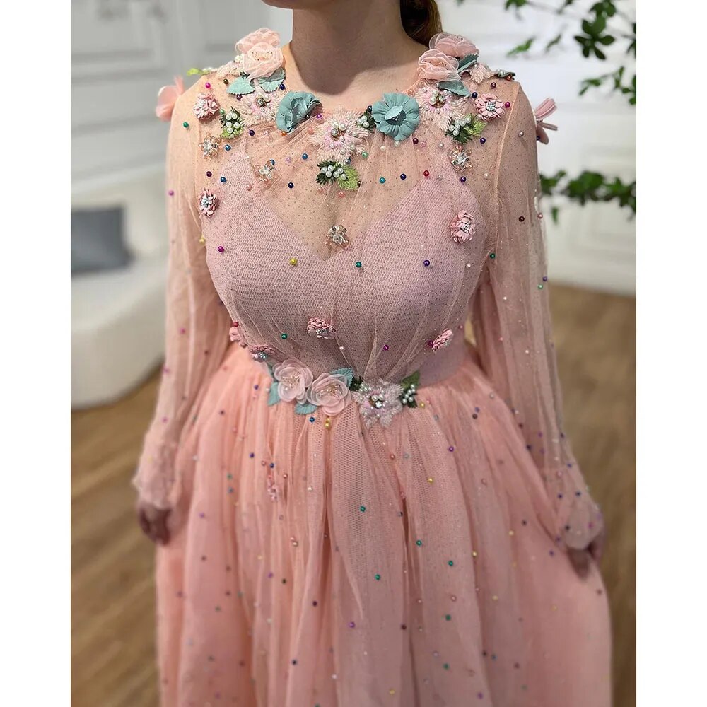 Vestidos de noche Dubái rosas, corte A, cuello redondo, manga larga, diseño 2025, hechos a mano, con flores y perlas, LA60766