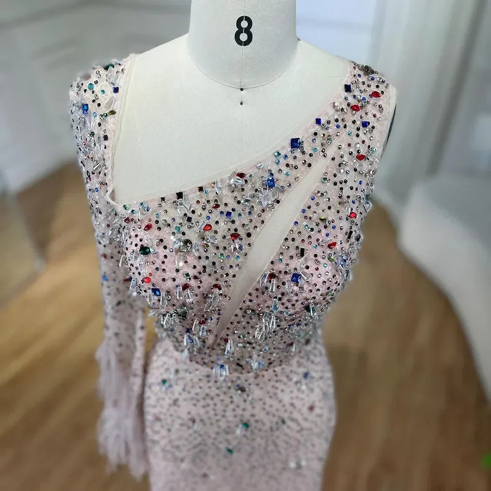 Vestido de noche elegante de sirena rosa con falda de plumas y cuentas de cristal para dama de honor, vestido de fiesta de boda 2025 LA72377