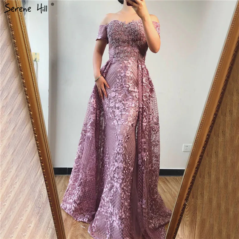 Vestidos de noche elegantes de sirena rosa con mangas cortas y flores, estilo Dubái 2025, sexys, con hombros descubiertos, encaje y cristales, LA70200