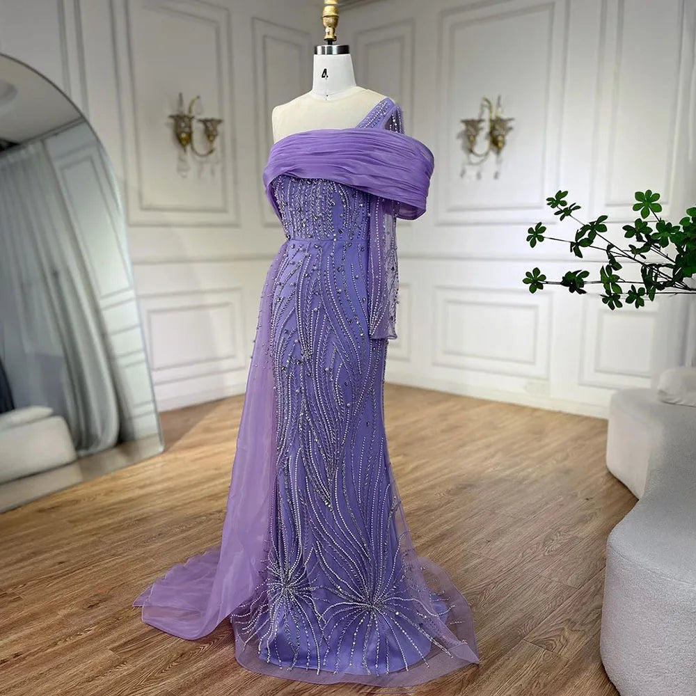 Vestido de noche árabe morado con cola lateral y perlas, un hombro, para mujer, para fiesta formal de graduación, boda, 2025 LA72332A