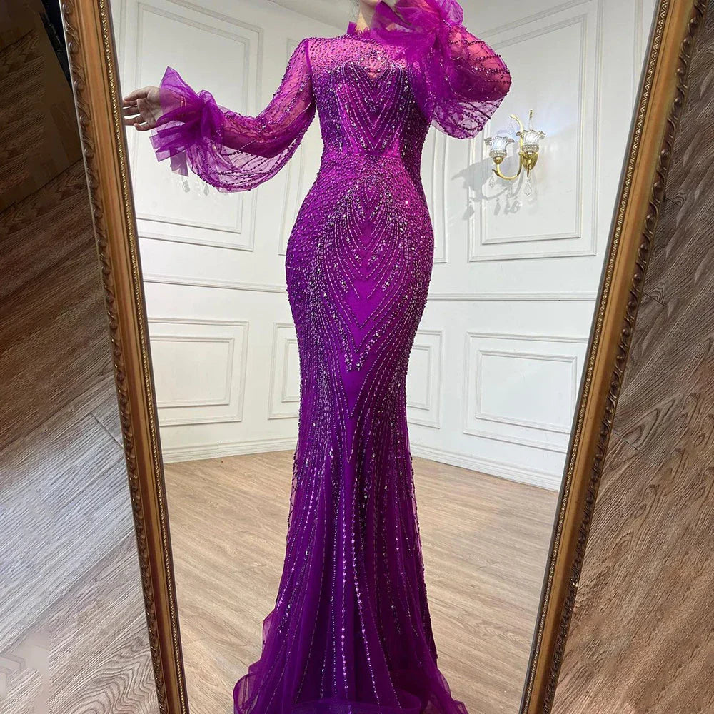 Vestido de noche elegante de sirena morado con cuello alto, mangas largas y cuentas, de lujo, para mujer, fiesta, LA71690