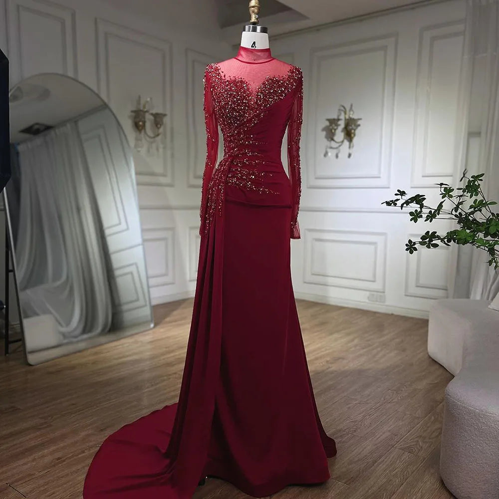 Vestido de noche de sirena de lujo con cuello alto y manga larga en oro rosa y falda para mujer, para fiesta 2025 LA71804