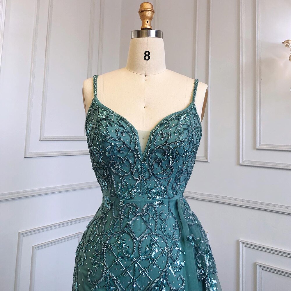 Vestido de noche árabe sexy con tirantes finos verdes y abertura alta, estilo sirena con cuentas, para mujer, fiesta, LA71568