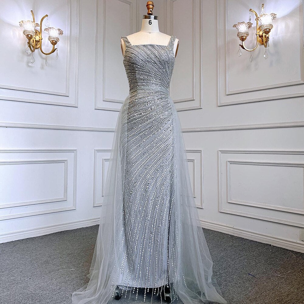 Vestido de noche árabe de lujo con cuentas y falda desmontable de sirena plateada sexy 2025 para mujer, fiesta LA71618