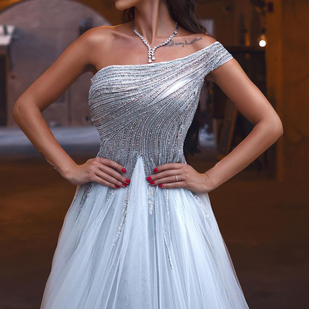 Vestidos de noche plateados de corte A con un solo hombro, 2025, de lujo, con cuentas, para mujer, fiesta, LA71672