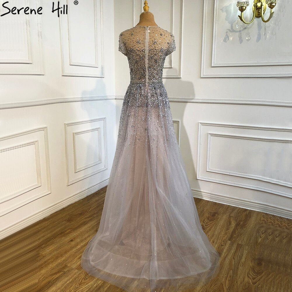 Vestido de noche de tul plateado estilo A, corte en A, estilo Dubái, manga corta, con pedrería, diseño LA70715
