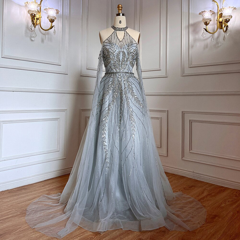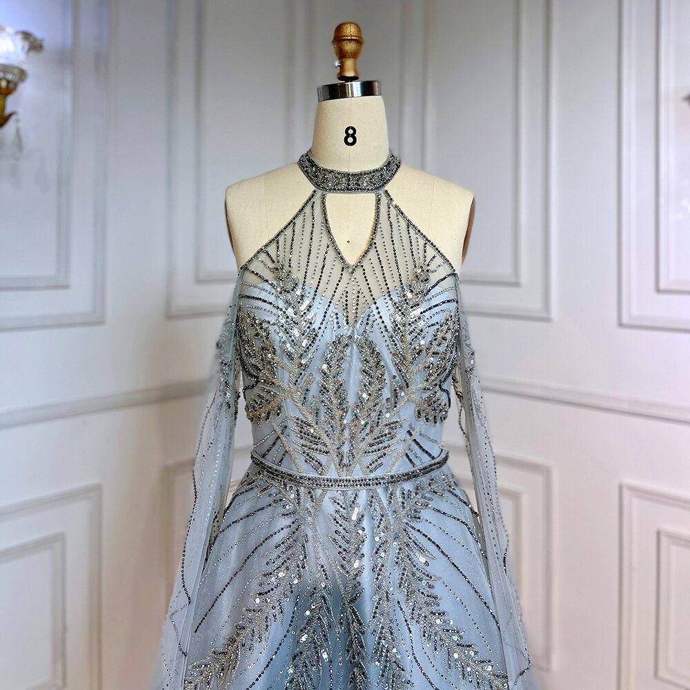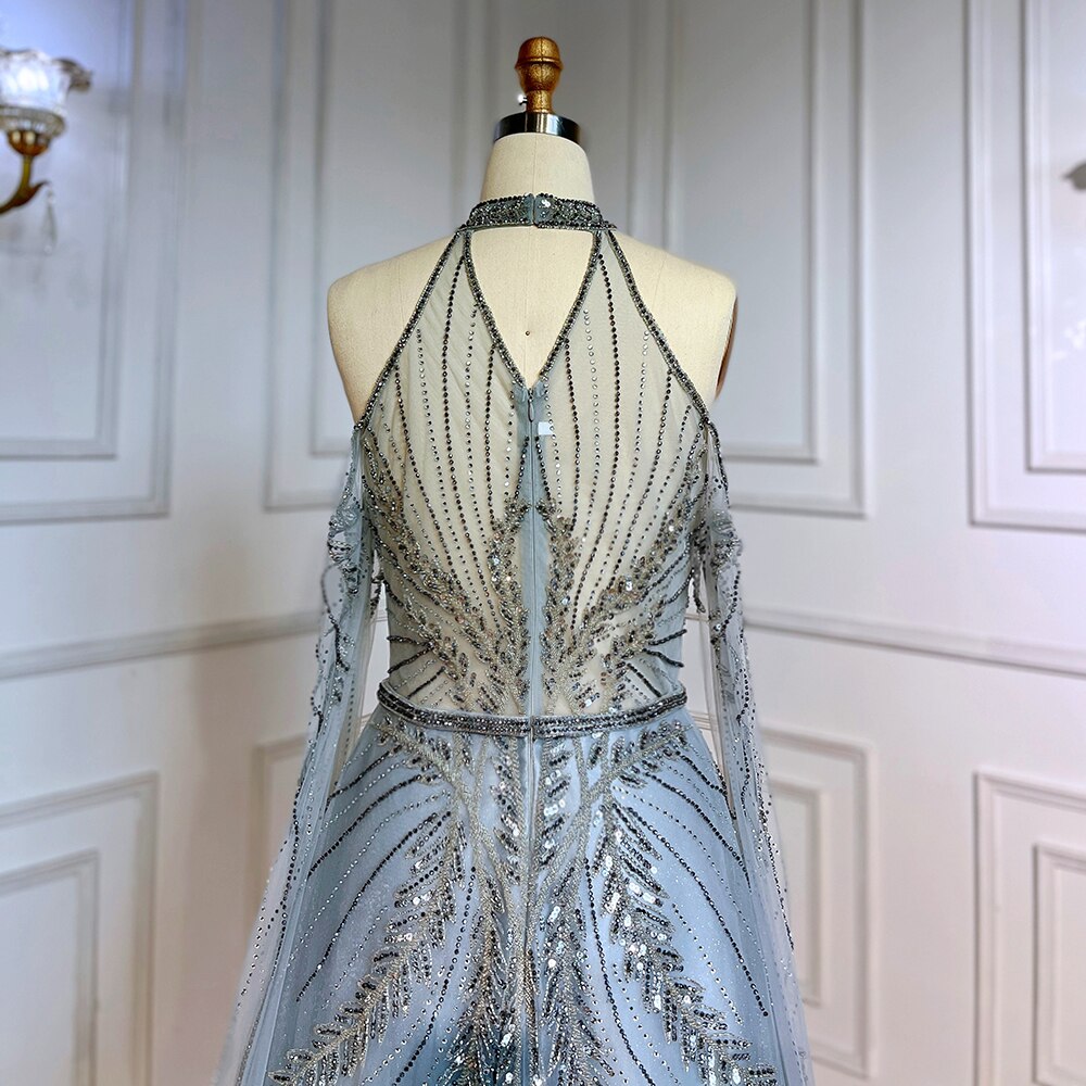 Vestido de noche de lujo con cuentas, corte A, sexy, azul plateado, con mangas tipo capa y escote en A, para mujer, estilo árabe, fiesta 2025, LA71828