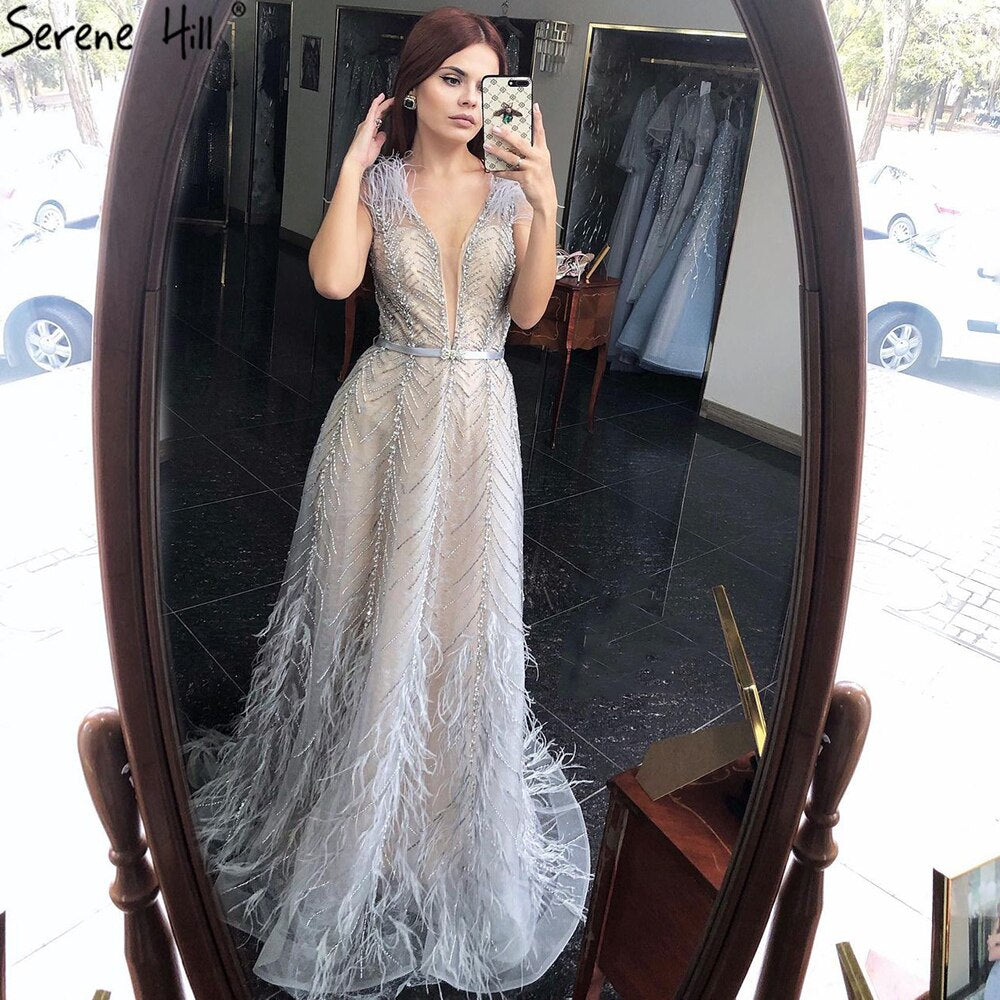 Vestidos de noche de lujo color nude plateados, 2025, con plumas y abalorios, corte en A, sexys, para mujer, para fiesta, LA70835