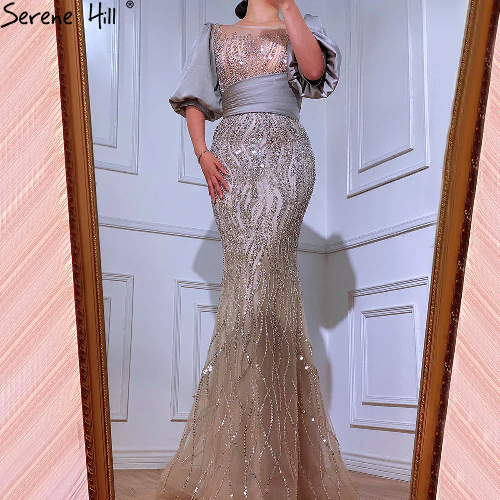 Vestido de noche de sirena de lujo color nude plateado con cuentas y mangas abullonadas, elegante para mujer para fiesta LA70809