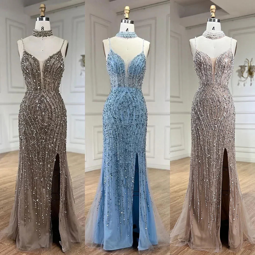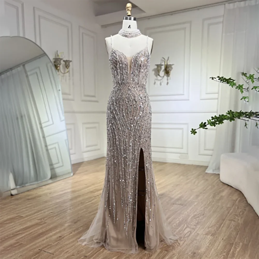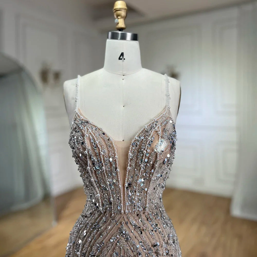 Vestido de noche de sirena color nude plateado con tirantes finos y cuentas, para mujer, para fiesta de graduación 2025 LA72047B