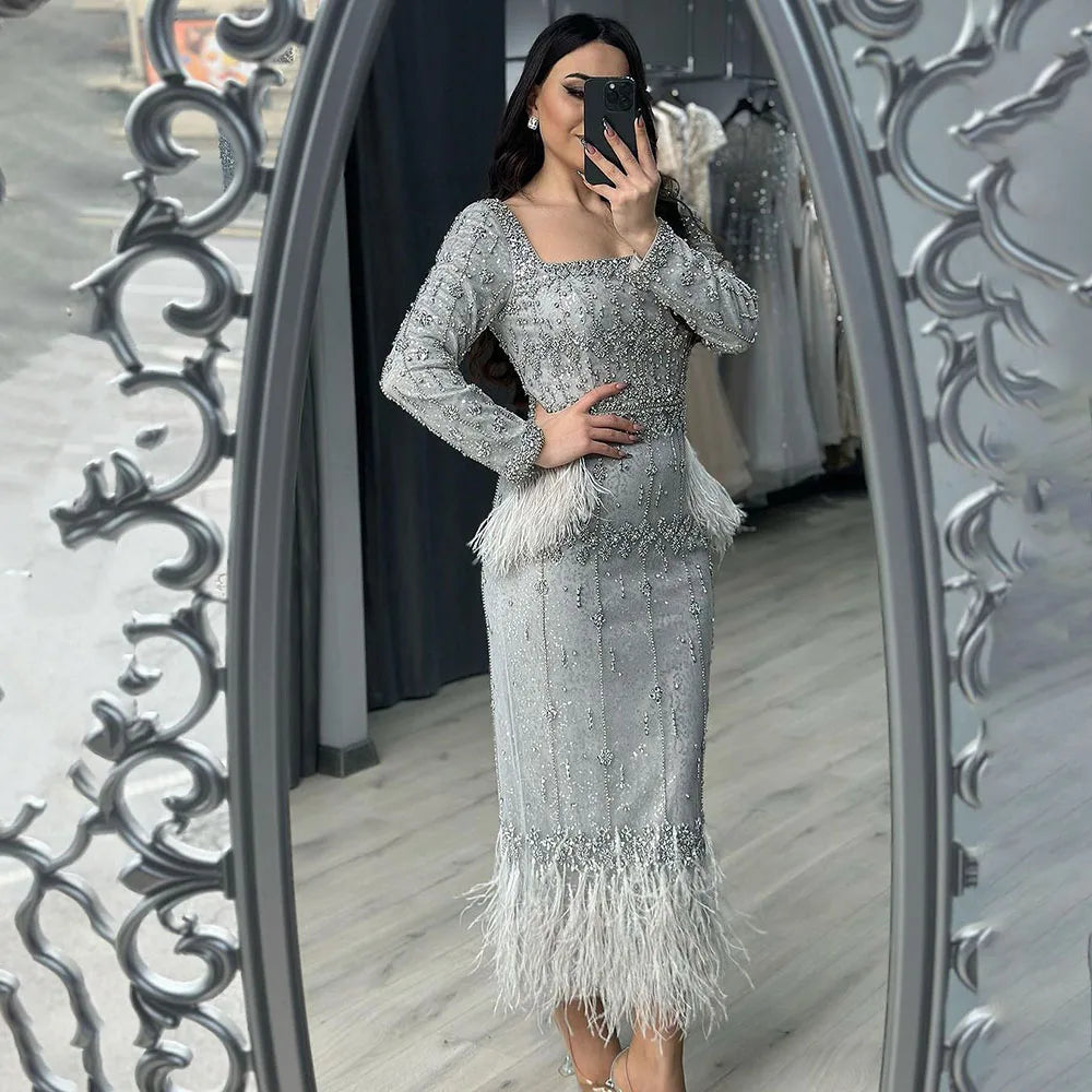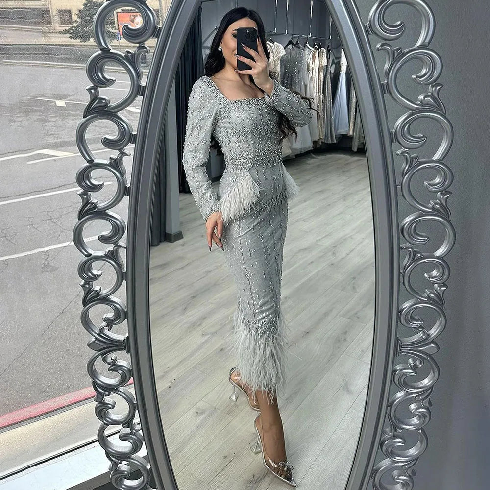 Vestido de noche de corte sirena gris plateado con plumas, largo hasta la rodilla, LA71669L