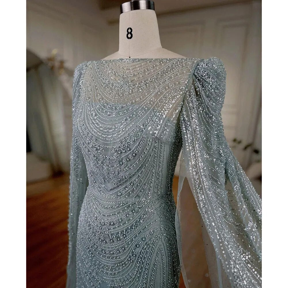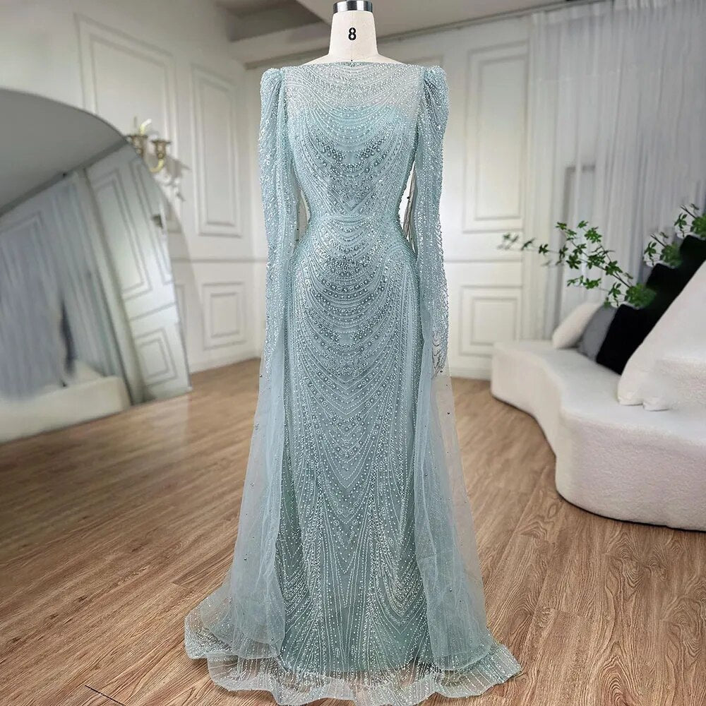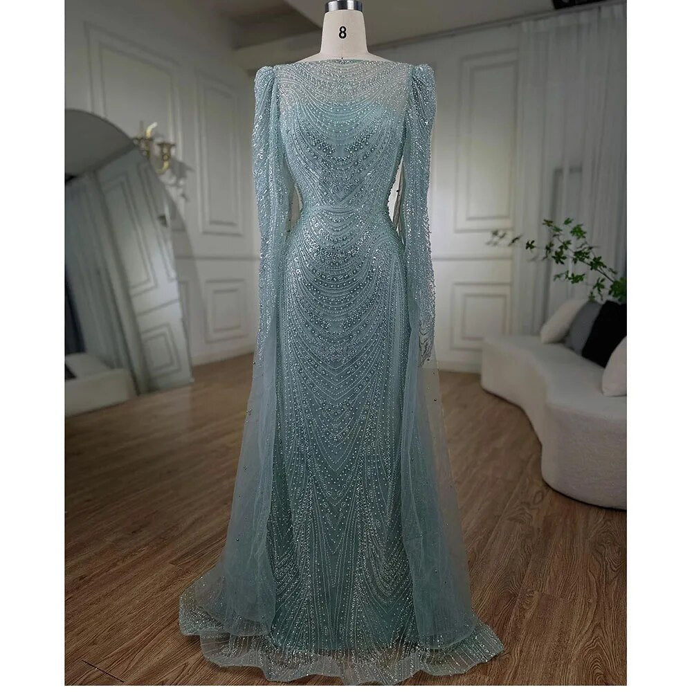 Vestidos de noche árabes de sirena con mangas de capa turquesa y cuentas de lujo para mujer, para fiesta de bodas 2025 LA72185