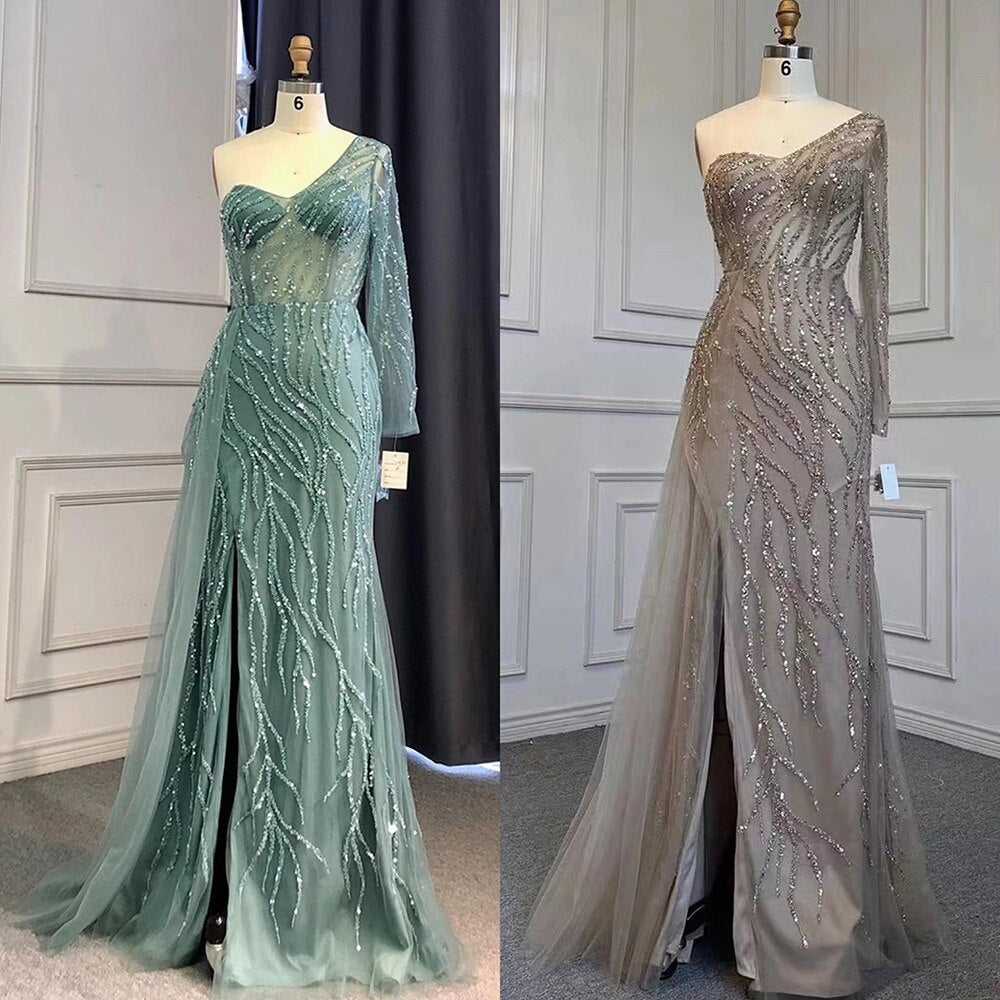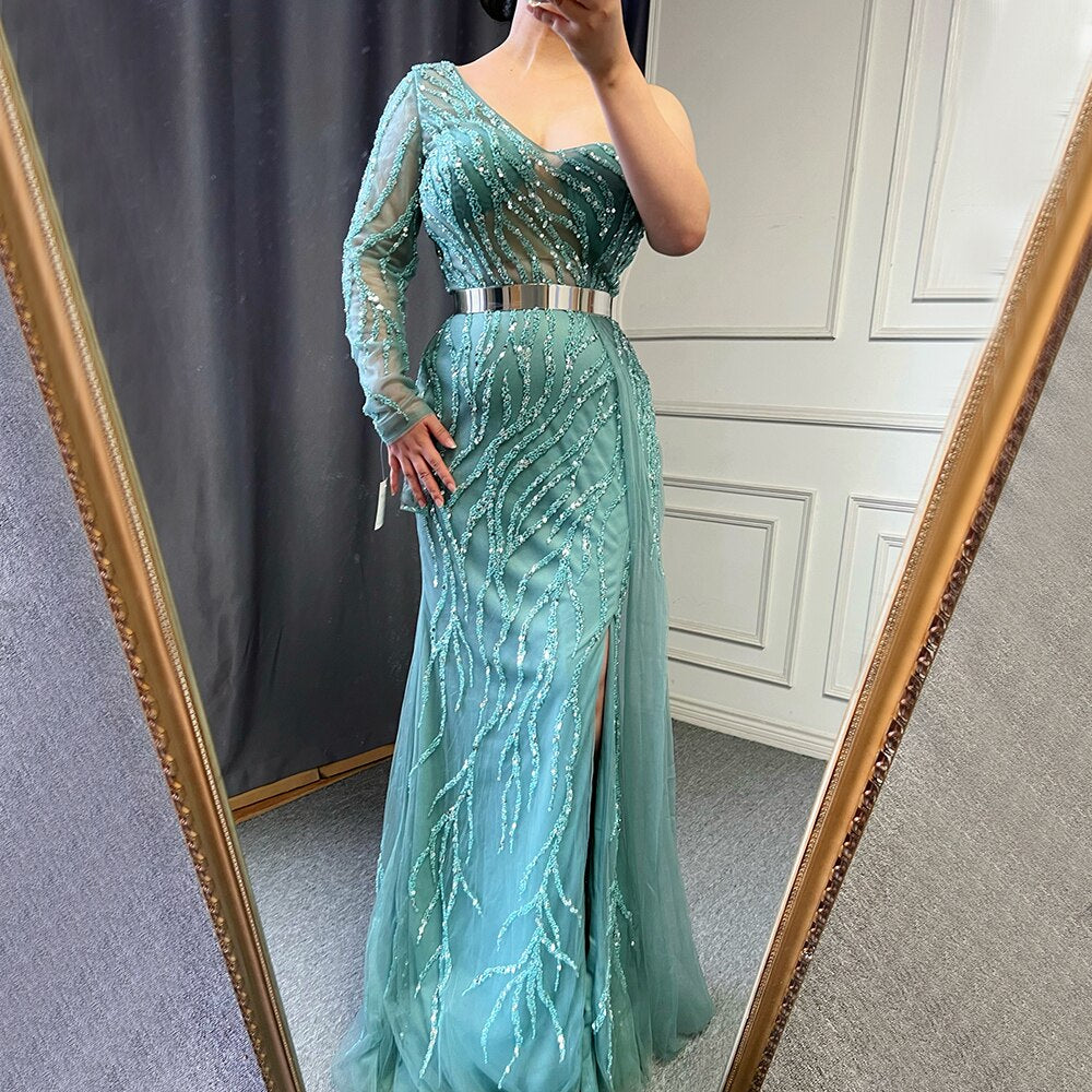 Vestido de noche de sirena turquesa con abertura alta, sexy, de un solo hombro y con sobrefalda de cuentas, para mujer, fiesta, LA71520
