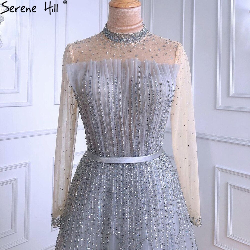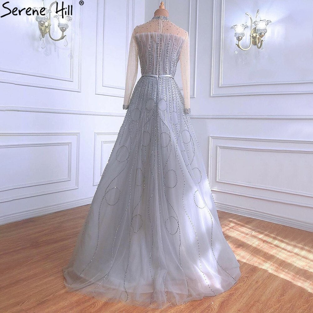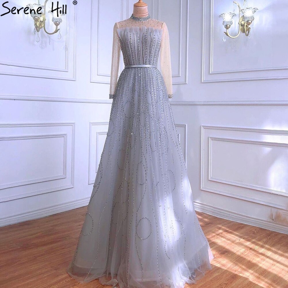 Vestidos de noche musulmanes grises de lujo, corte A, 2025, mangas largas con cuentas, para mujer, fiesta de bodas LA71014