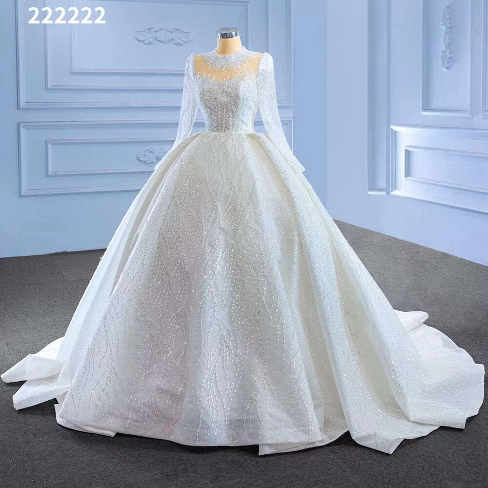 Vestido de novia blanco de alta gama con encaje de cuentas, mangas largas y cuello redondo, hecho a medida HM222222