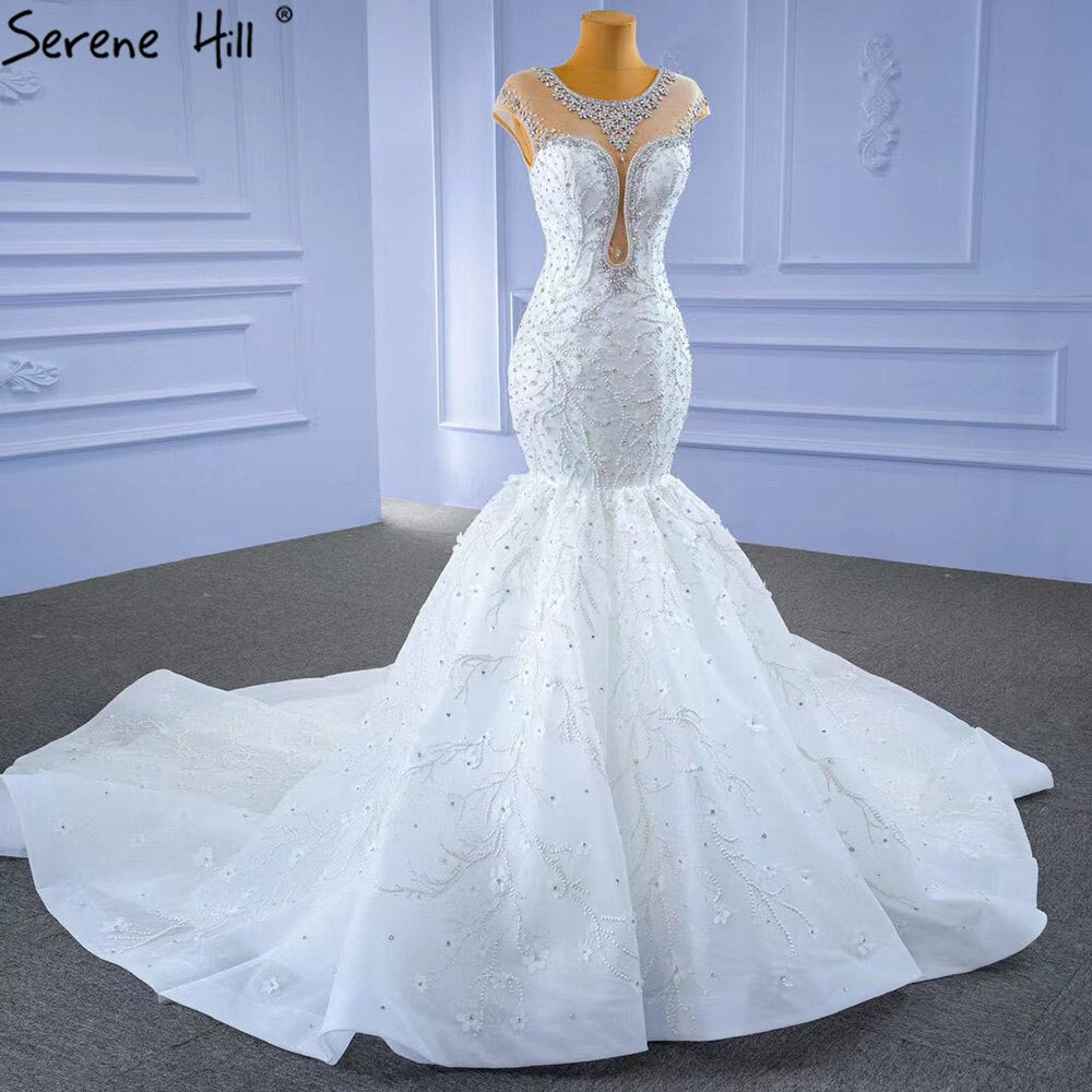 Vestidos de novia blancos de lujo con corte sirena, elegantes, con cuentas y diamantes, mangas casquillo, HM67296, hechos a medida, 2025
