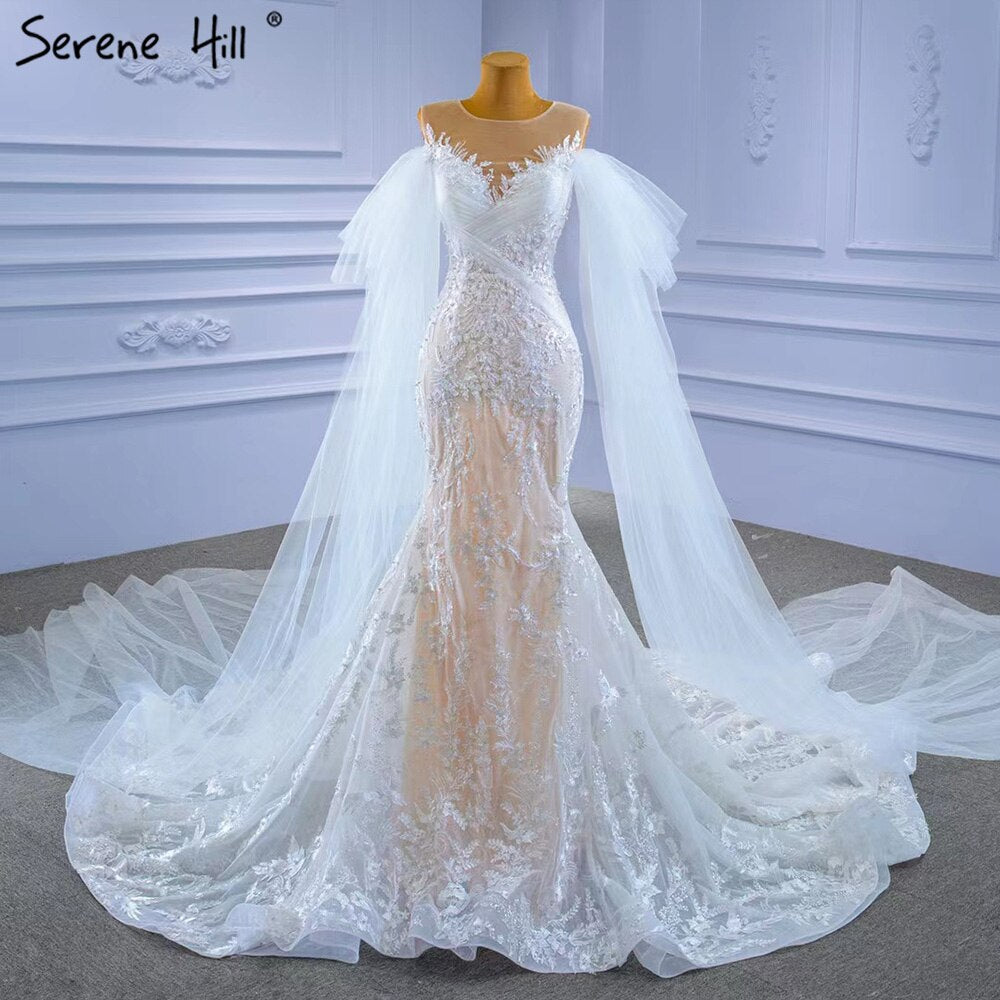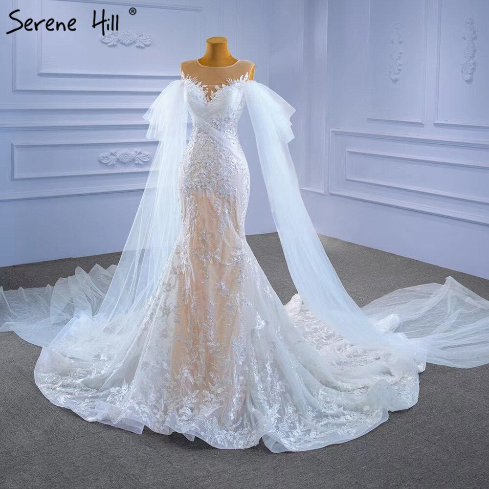 Vestidos de novia de sirena color nude blanco 2025 con encaje de cuentas, elegantes mangas de capa, vestidos de novia HM67294 hechos a medida