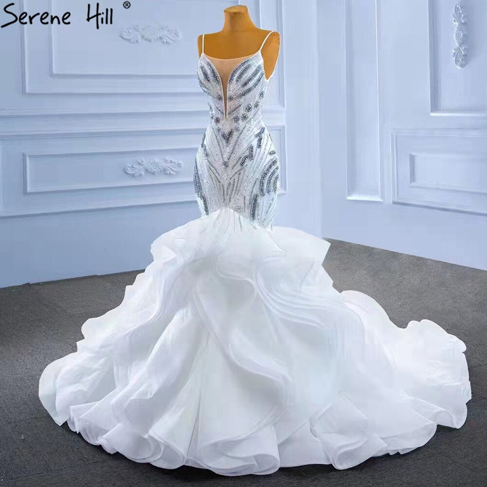 Vestido de novia elegante de lujo con volantes blancos y cuentas, corte sirena y tirantes finos, HM67386, 2025