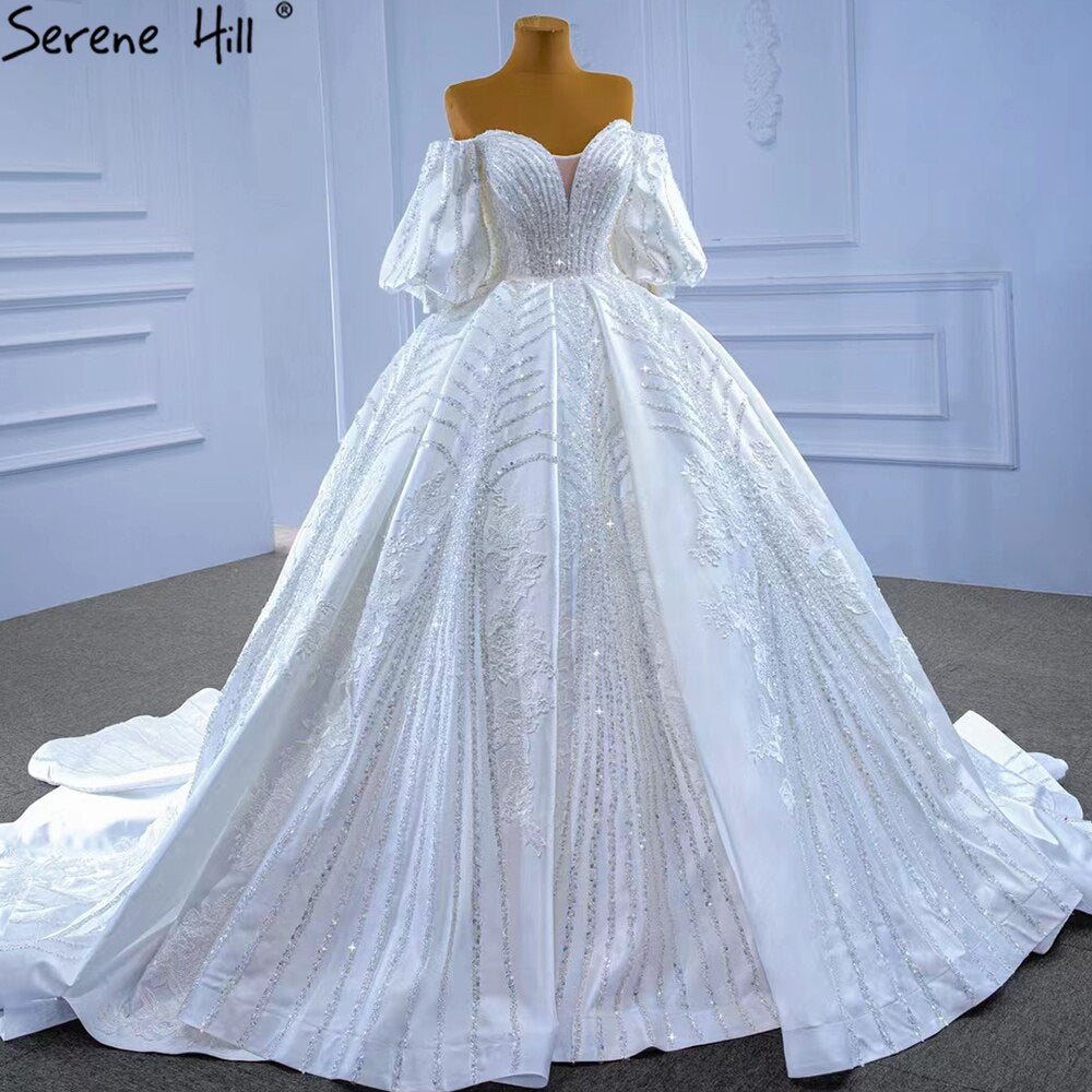 Vestidos de novia de lujo en satén blanco 2025 con mangas farol y cuentas HM67326, hechos a medida