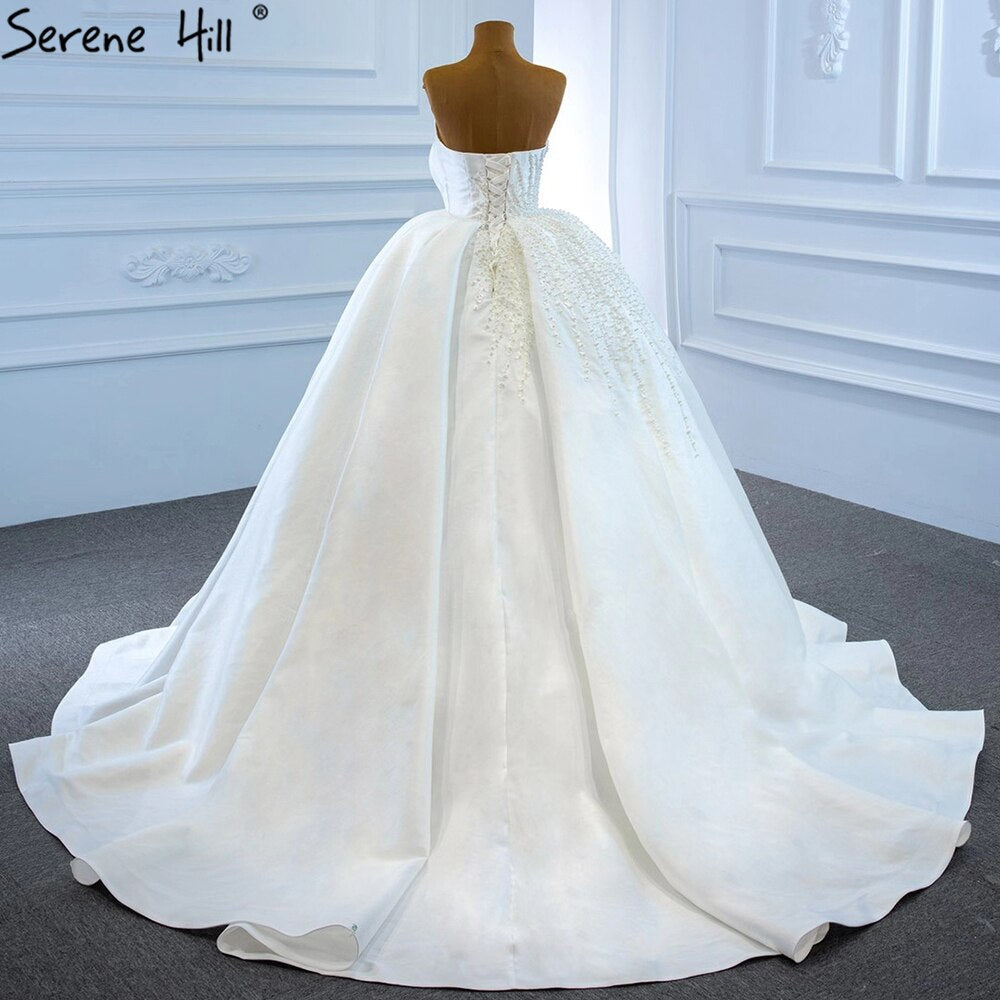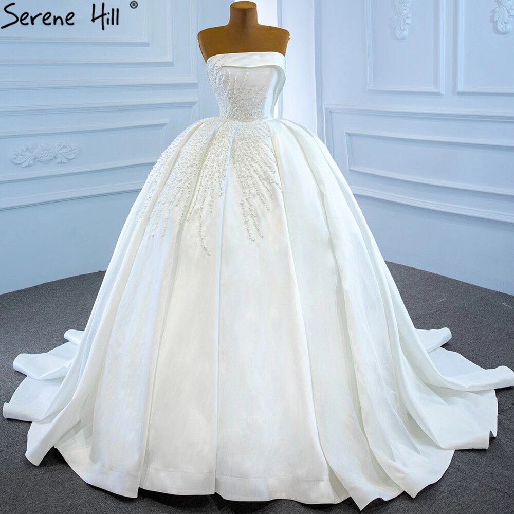 Vestido de novia de satén blanco sin tirantes, de lujo, con cuentas y perlas, sexy, 2025 HM67214, hecho a medida.