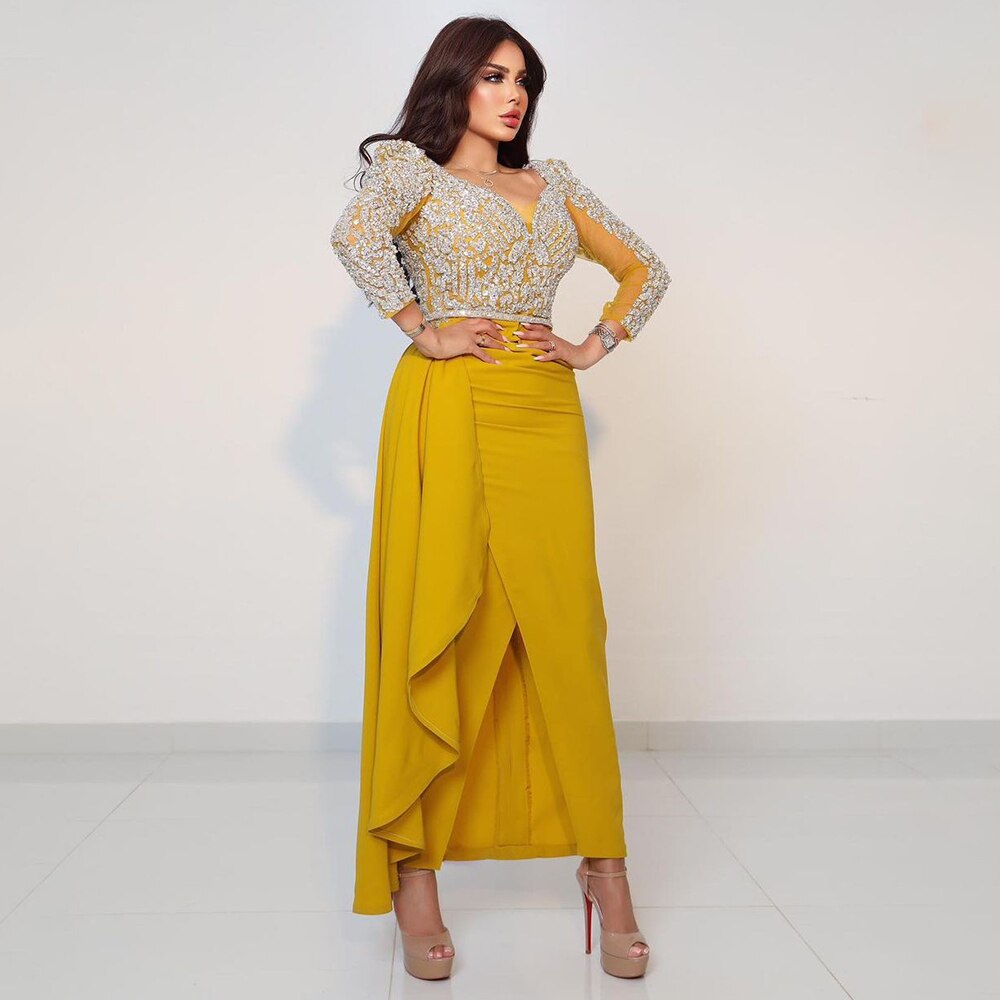 Vestidos de noche amarillos de sirena con mangas largas y falda con cuentas, estilo Dubái, de longitud media, para mujer 2025, LA72079