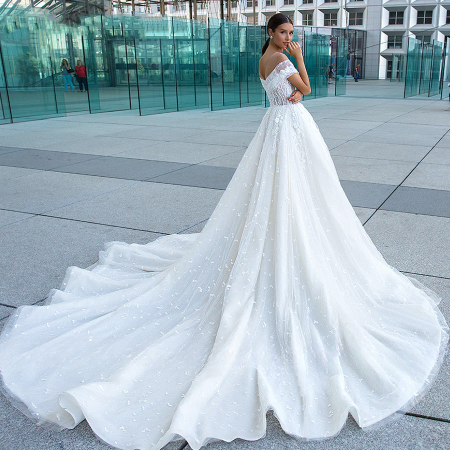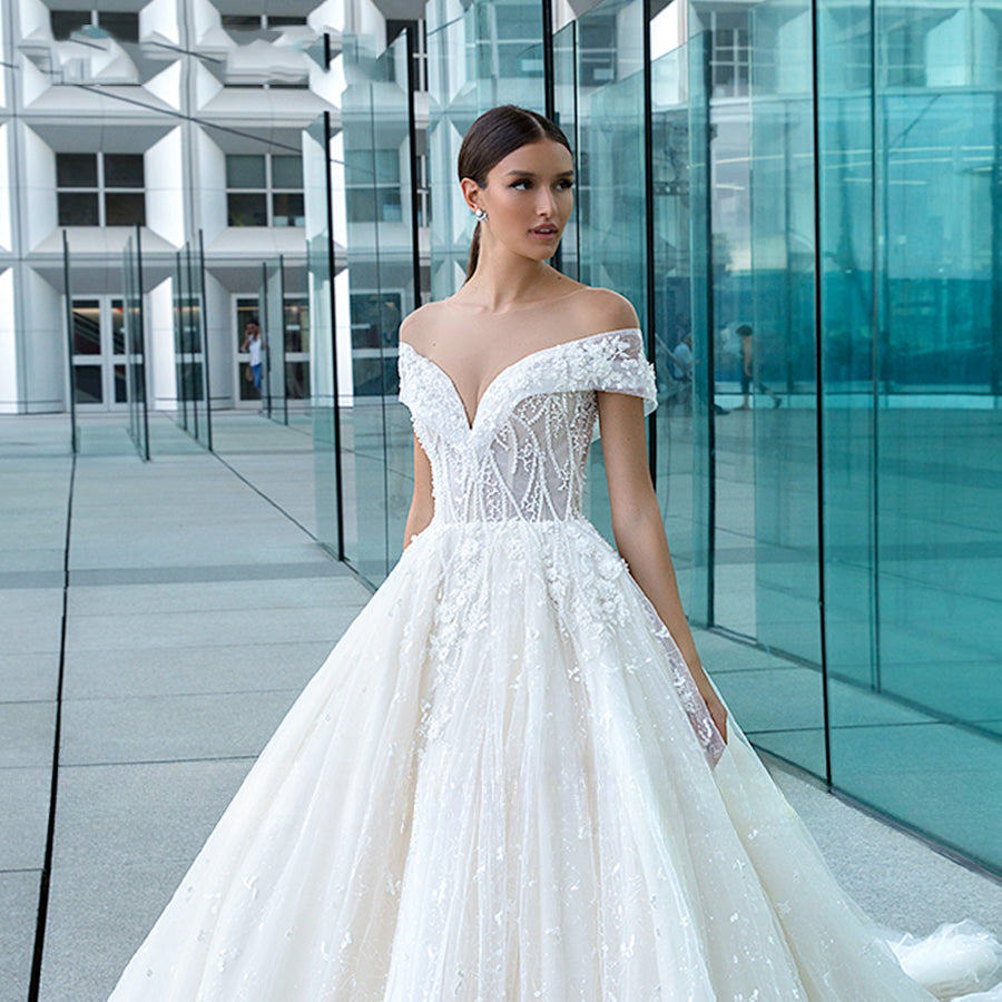 Vestidos de novia de encaje con escote corazón, estilo princesa, con escote en V y detalles decorativos. Ideales para bodas formales y fiestas, con hombros descubiertos y cuentas. Colección 2023. Románticos vestidos de novia.