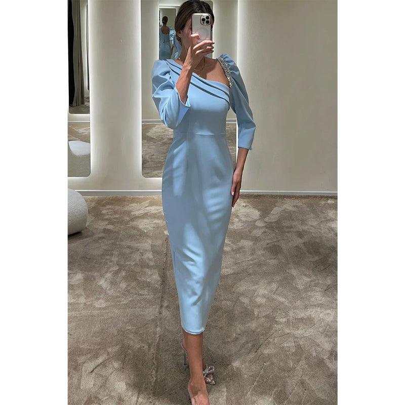 Vestido de noche formal con escote barco, mangas 3/4 y cuentas, corte tubo/columna