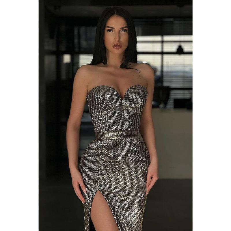 Vestido de fiesta tubo/columna con escote en forma de corazón, brillante y abertura