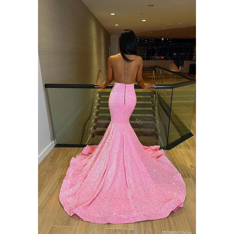 Vestido de noche formal con escote en V, sin mangas, con lentejuelas y cuentas, corte tubo/columna