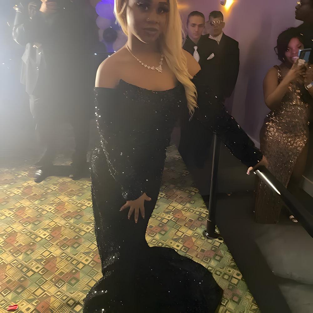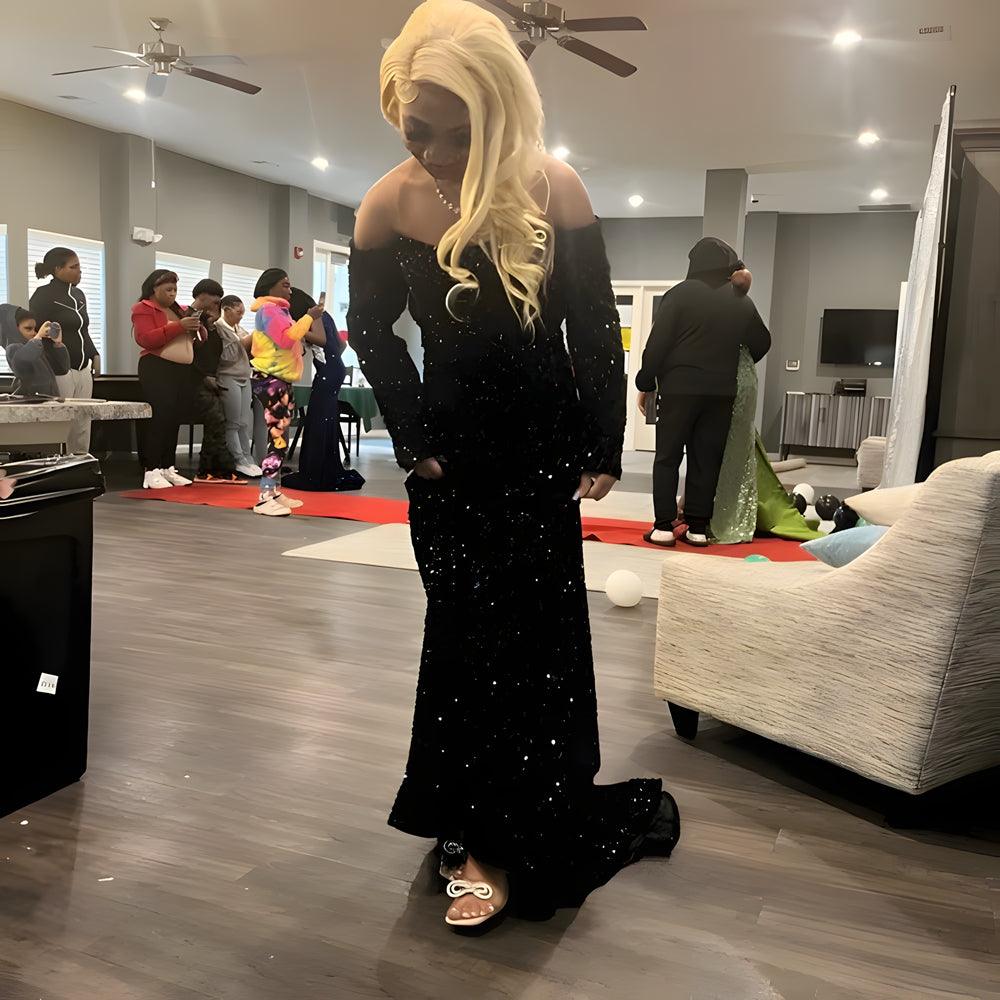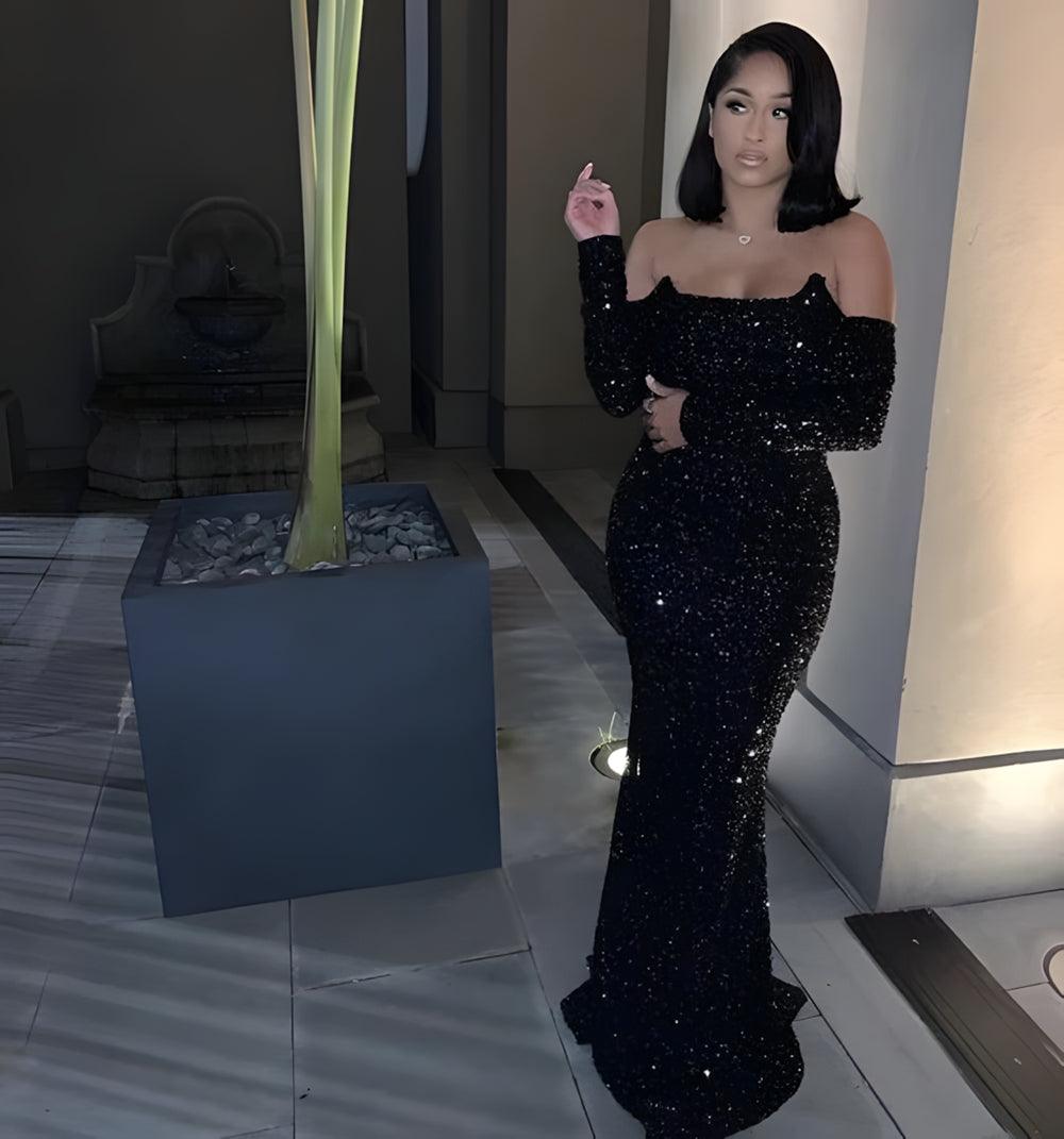 Vestido de noche de corte recto/columna, terciopelo con lentejuelas, hombros descubiertos, mangas largas y cola corta.