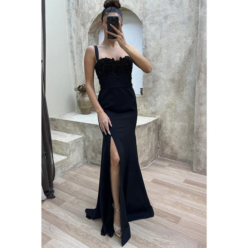Vestido de fiesta largo con tirantes finos y cuentas, con abertura en la espalda