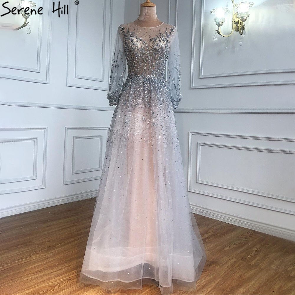 Vestido de noche de lujo plateado estilo Dubái, de manga larga, corte A, con lentejuelas y cuentas, sexy, LA70418