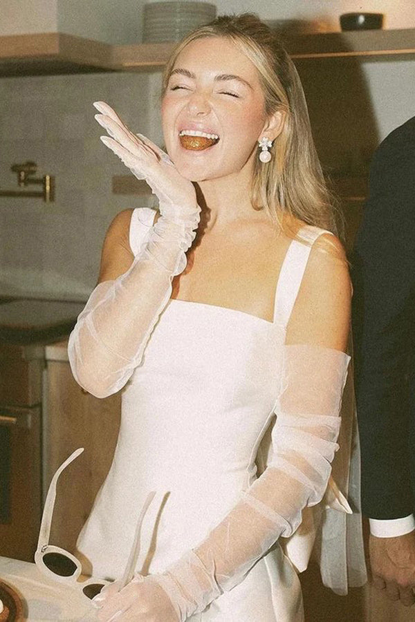 Como expertos en vestidos de novia, presentamos nuestro sencillo vestido de novia corto de satén marfil con lazo en la espalda (WD727). Luce elegante y sencilla con este precioso vestido de novia a un precio accesible. Su corte corto y el delicado lazo en la espalda le dan un toque moderno a tu día especial.