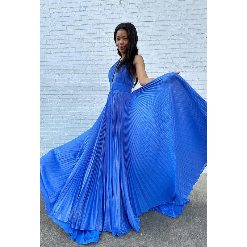 Vestido sencillo e informal de corte A con cuello halter, sin mangas, con abertura lateral y espalda descubierta para fiesta y graduación