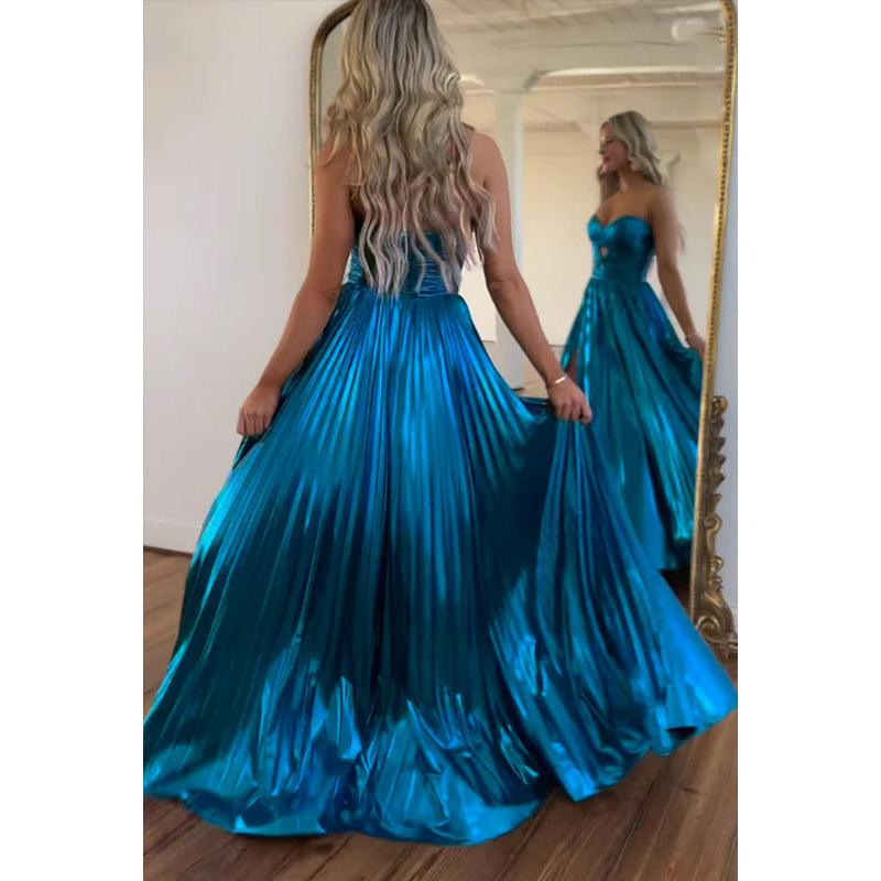 Vestido de fiesta sencillo e informal, sin mangas, fruncido, con abertura lateral y hombros descubiertos