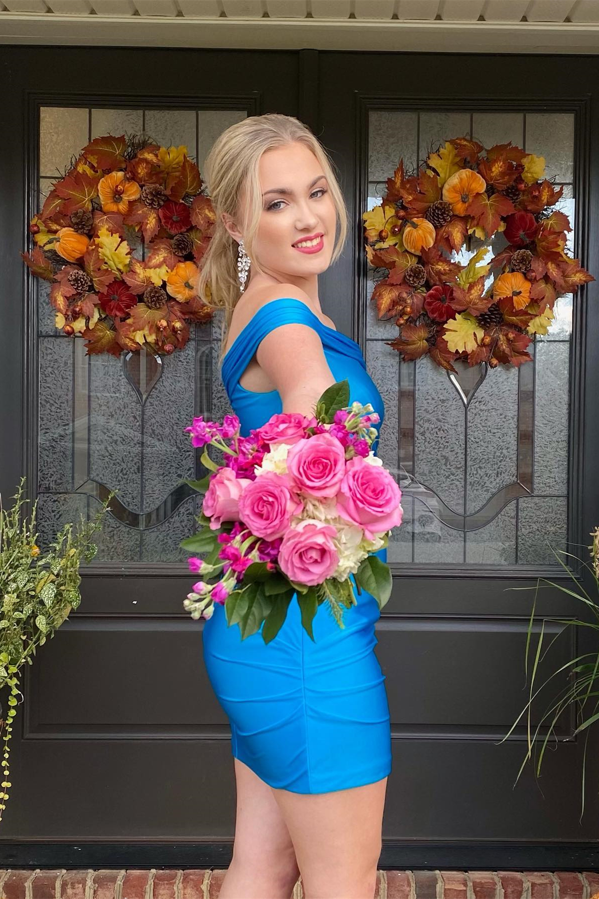 Vestido corto ajustado Simply Blue con hombros descubiertos para fiesta de bienvenida Y3016
