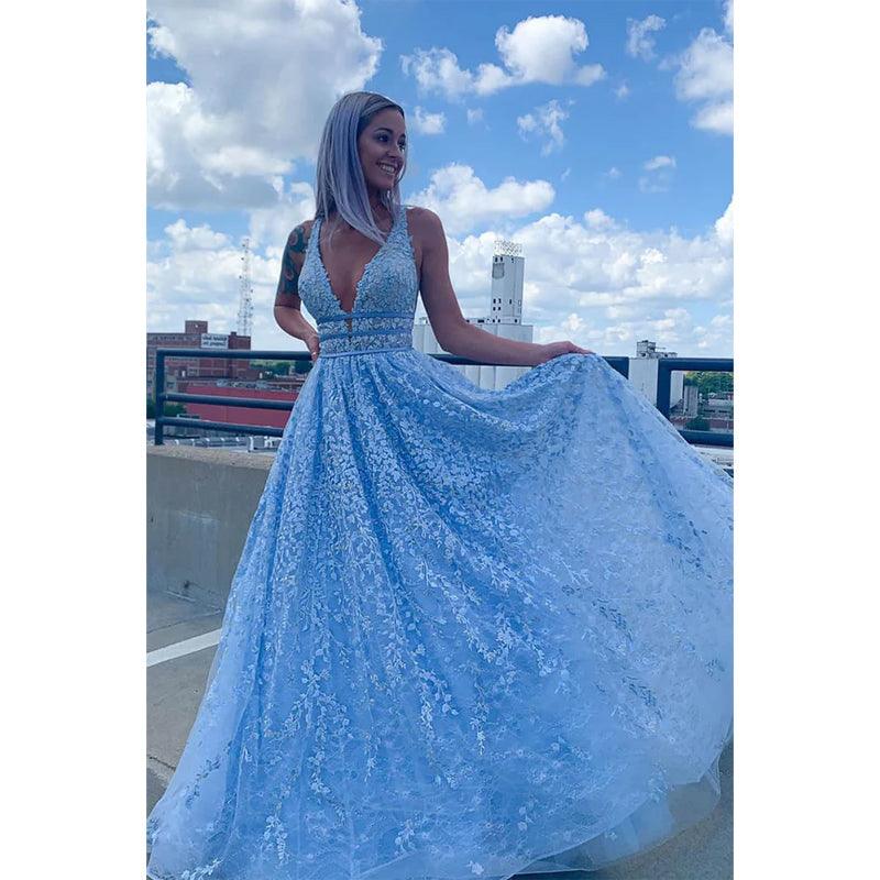 Vestido de fiesta largo de encaje azul cielo con escote en V profundo y corte A