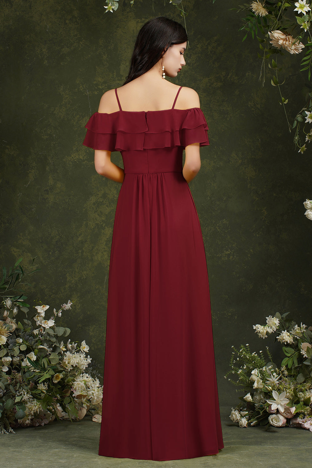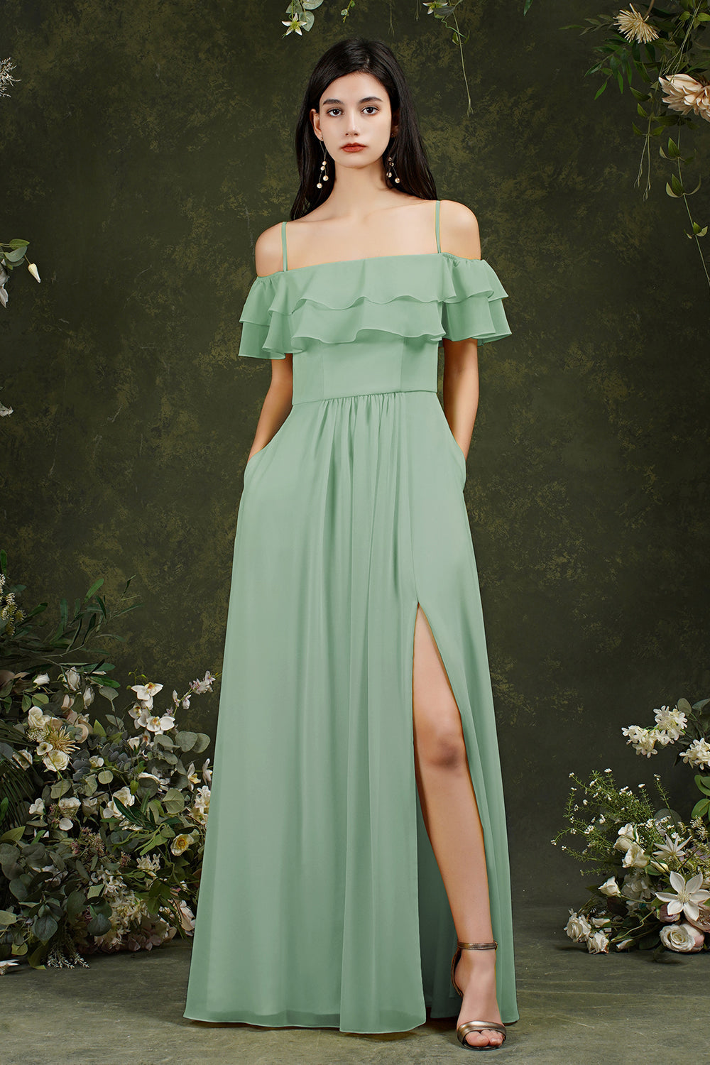 Vestido de graduación de tul con tirantes finos, hombros descubiertos y abertura frontal