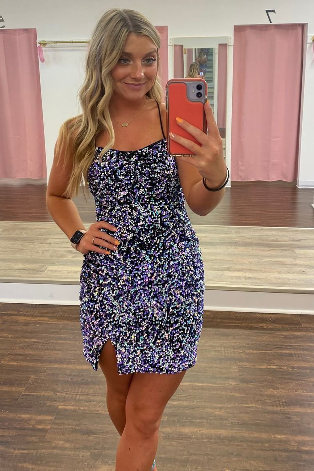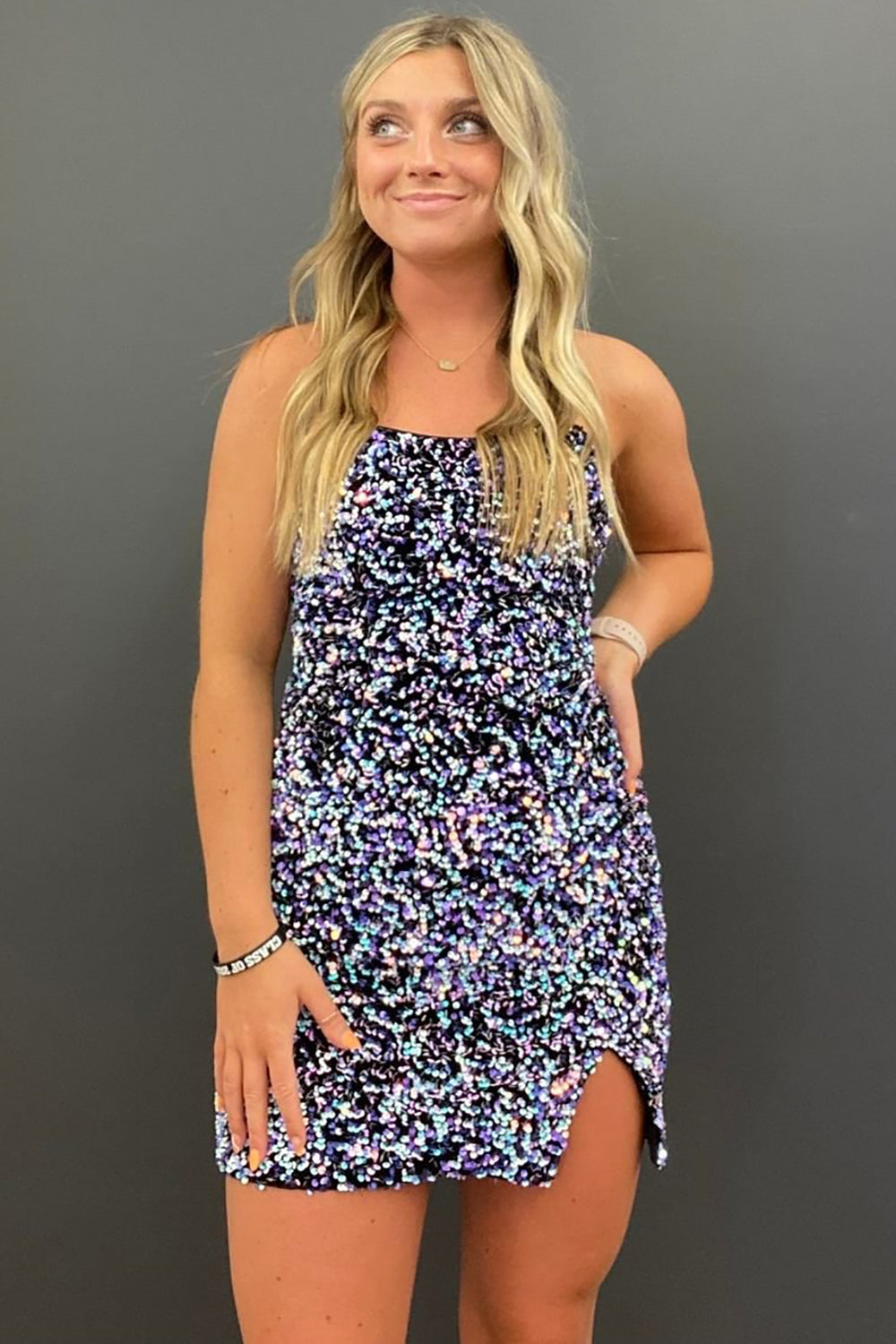 Vestido corto de fiesta con lentejuelas moradas, tirantes finos y espalda cruzada, estilo tubo brillante.
