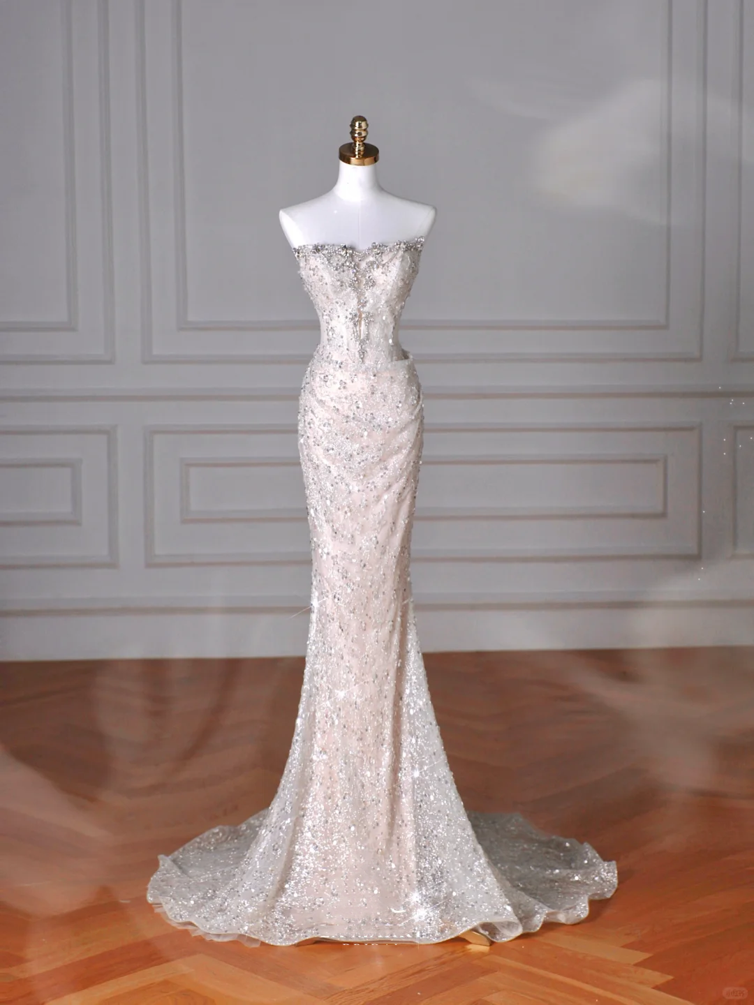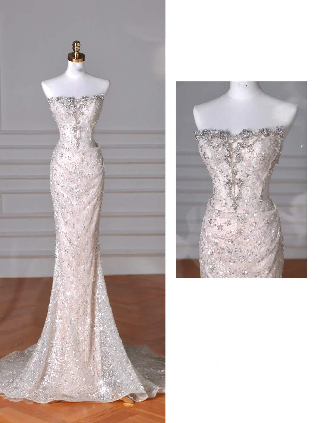 Vestido de noche largo de sirena con lentejuelas y tul sin tirantes brillante Y8616