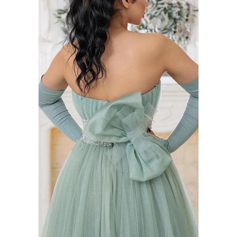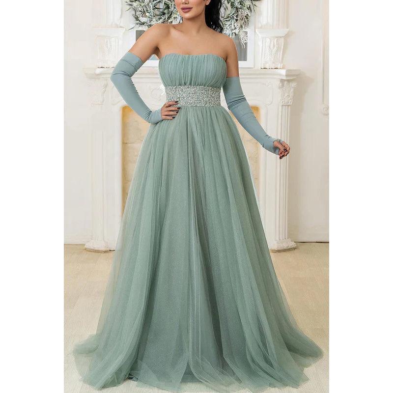 Vestido de novia largo de corte A, sin tirantes, sin mangas, con lentejuelas y tul fruncido.