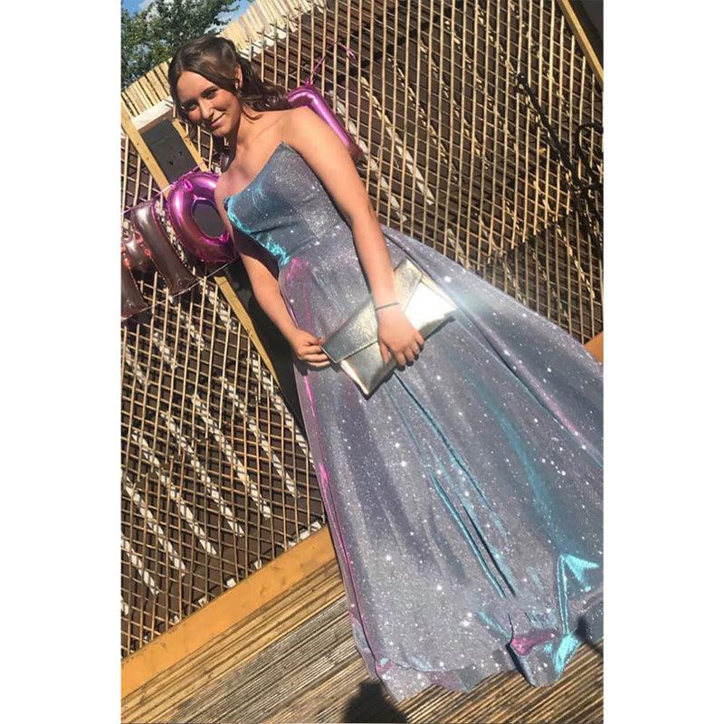 Vestido de fiesta largo de satén morado sin tirantes, corte en A, con lentejuelas y abertura