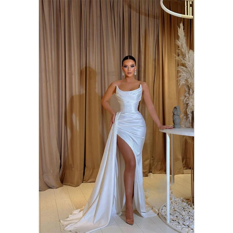 Vestido largo de fiesta formal de satén sin tirantes con pliegues y abertura lateral. Incluye guantes.