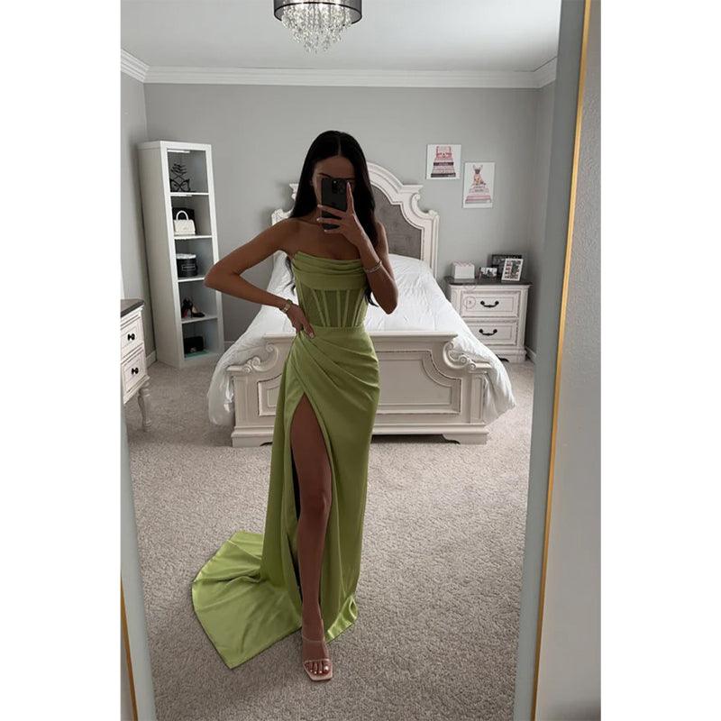 Vestido largo de fiesta verde de satén sin tirantes con pliegues y abertura lateral