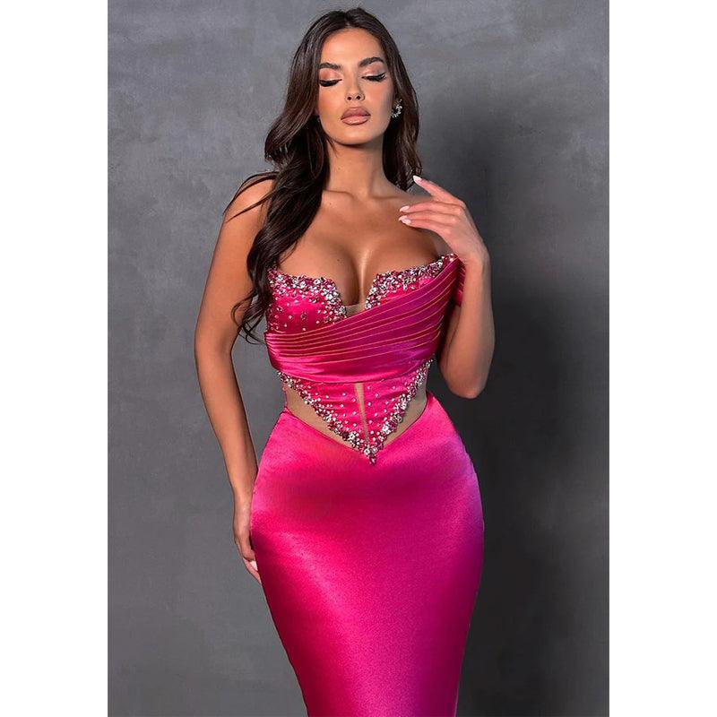 Vestido de noche formal de sirena sin tirantes, de satén con pliegues y cuentas