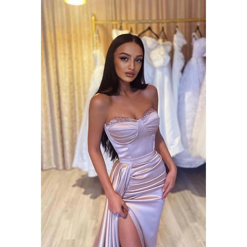 Vestido largo de noche de fiesta sin tirantes, con lentejuelas y fruncido, corte sirena, de satén.
